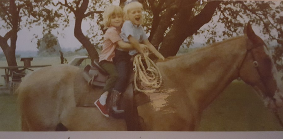 This is a picture of my cousin Pam (and me, holding on for dear life) on my grandfather’s horse, at the annual Easter reunion on my grandparent’s farm, a million years ago. When I was 11 years old, Pam taught me the Bus Stop Hustle and now, whenever I hear the song, I’m transported back …